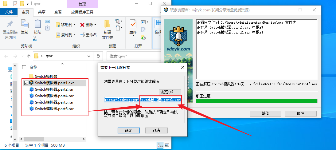 6. 注意如果解压到一半,提示需要有以下分卷才能继续解压,说明压缩包没有全部下载完,或者没有全部放在同一目录中。请检查一下你下载的压缩包是否完整,并放在同一目录下。